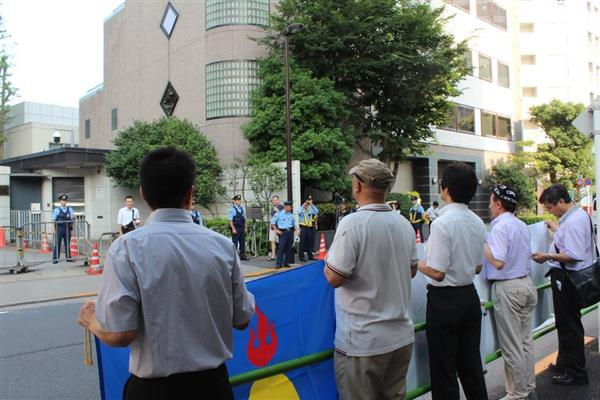 写真:中国大使館に向かって抗議の声を上げる人々。右から2人目がトゥール・ムハメットさん。中央が吉田康一郎元東京都議、左端がオルホノド・ダイチンさん=8日、東京都港区(三枝玄太郎撮影)